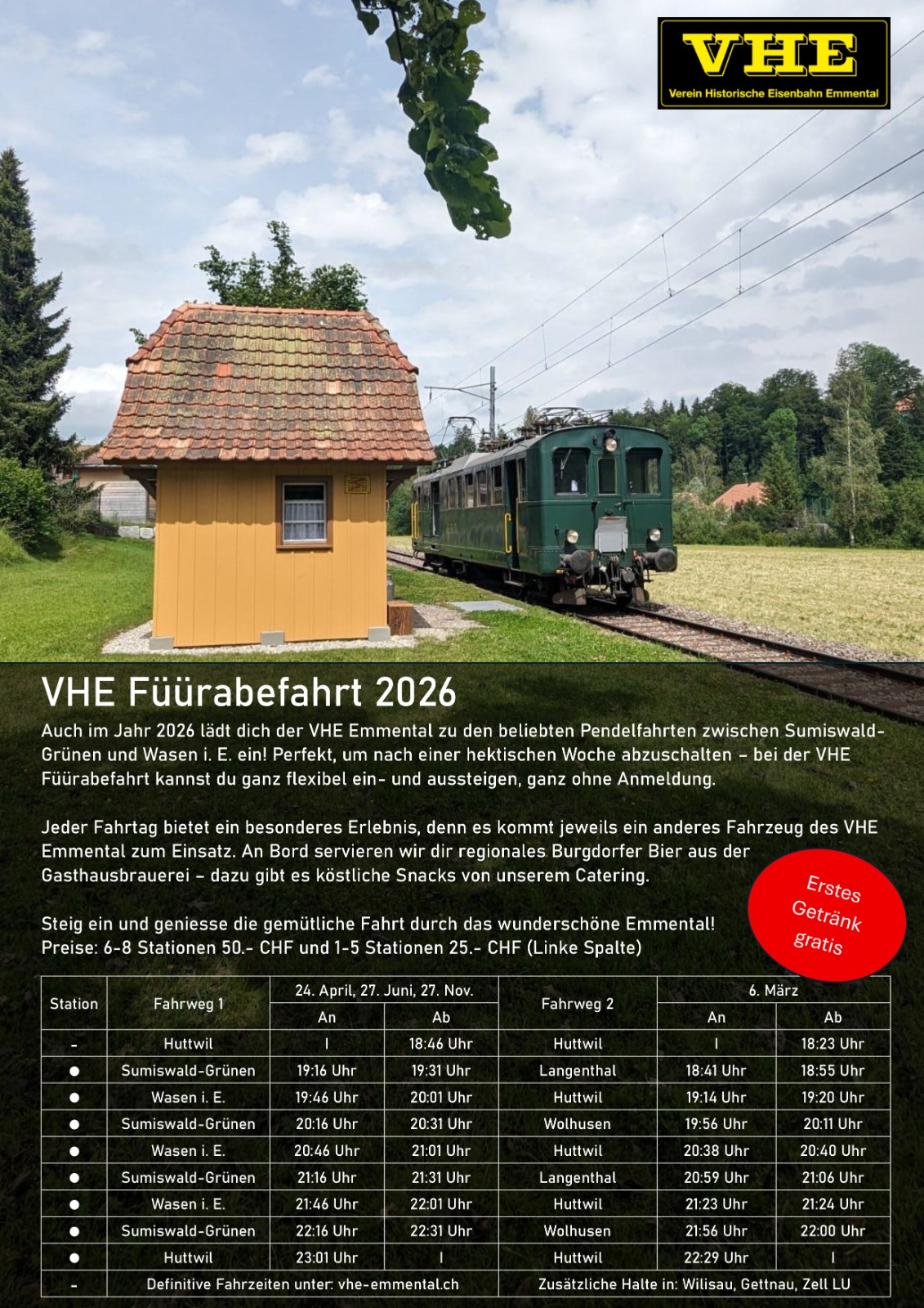 Auch im Jahr 2026 lädt der Verein Historische Eisenbahn Emmental (VHE) zu den beliebten Pendelfahrten am Freitagabend ein! Perfekt, um nach einer hektischen Woche abzuschalten – bei der VHE