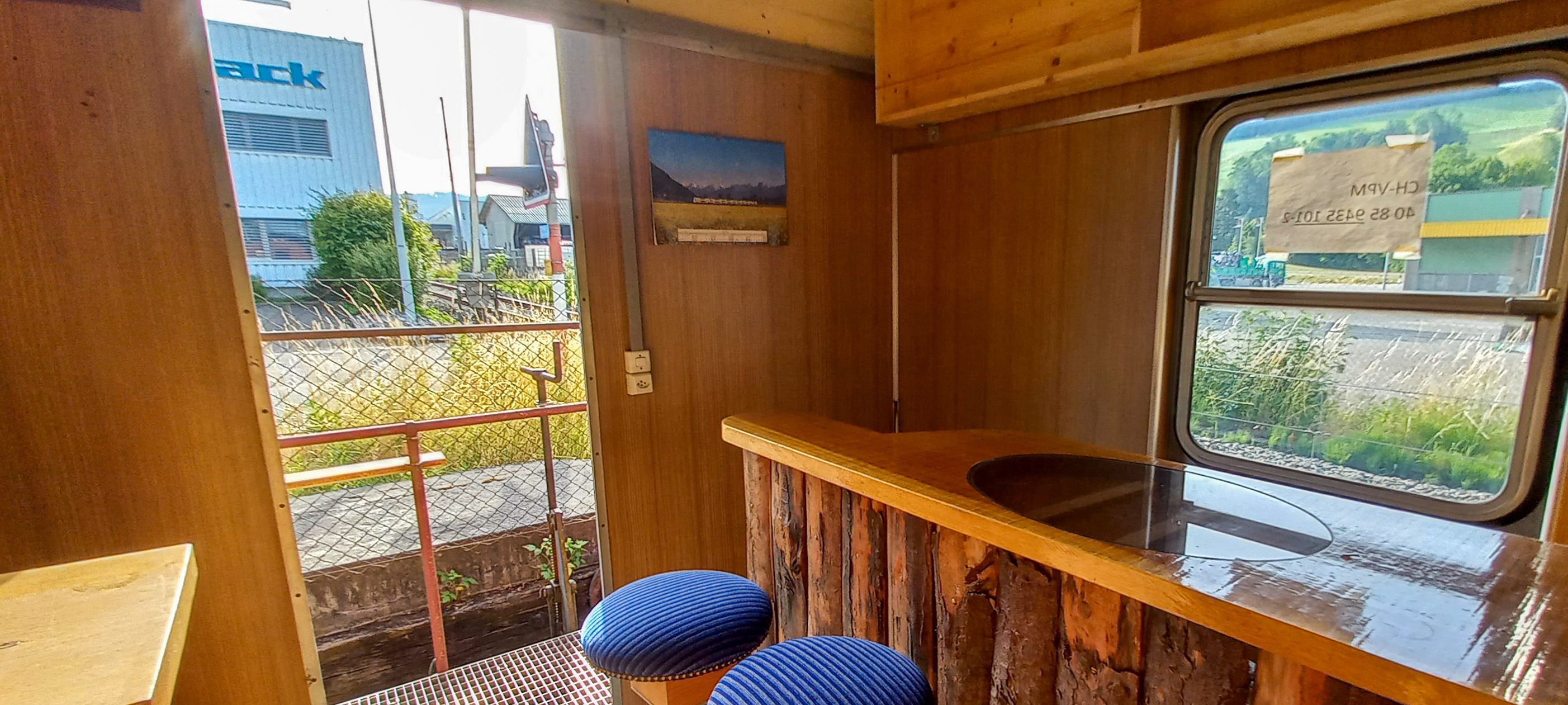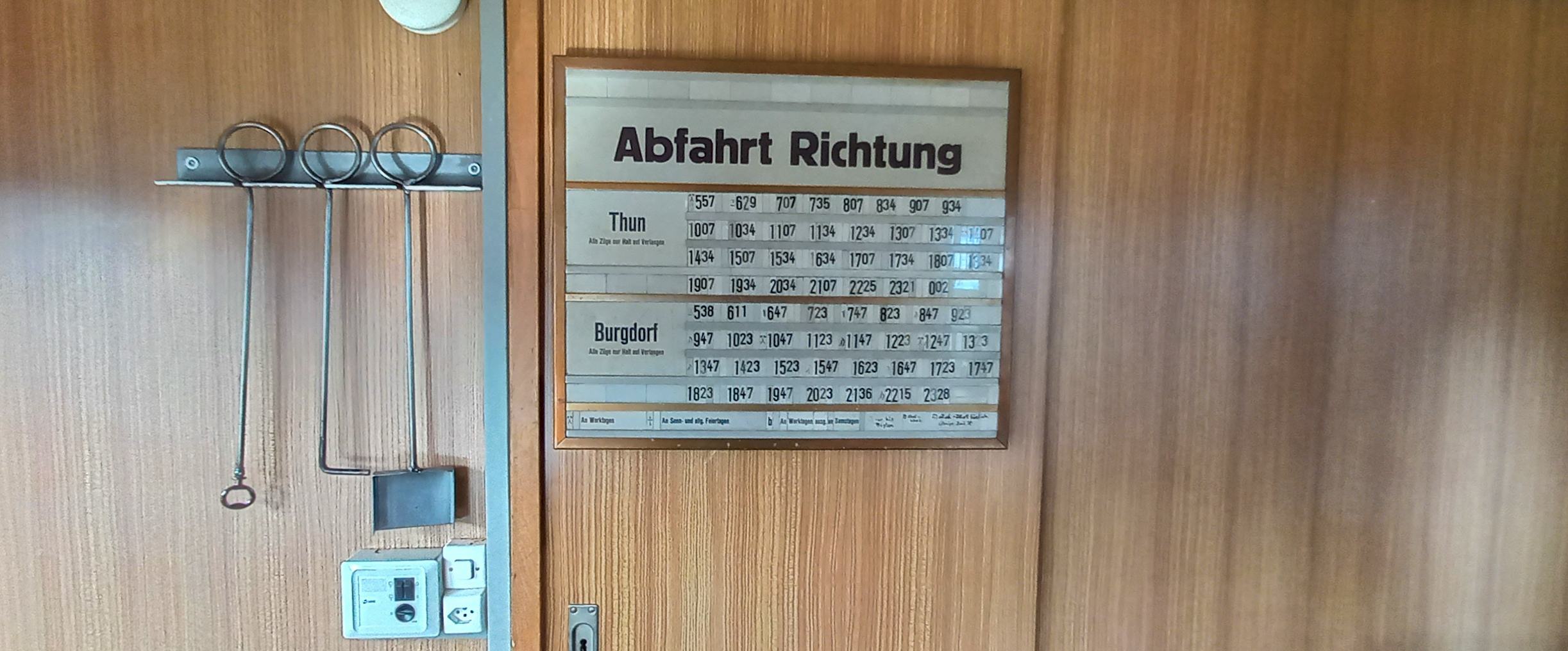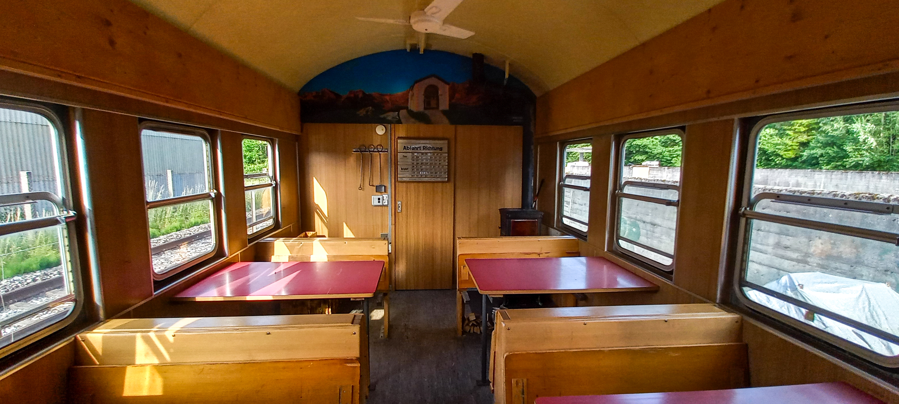 Als Delikatesse wird der Wagen laufend mit Utensilien aus der Bahnwelt im Emmental sowie dem VPM ausgeschmückt, hier eine alte Fahrplantafel (vermutlich von Schwäbis).