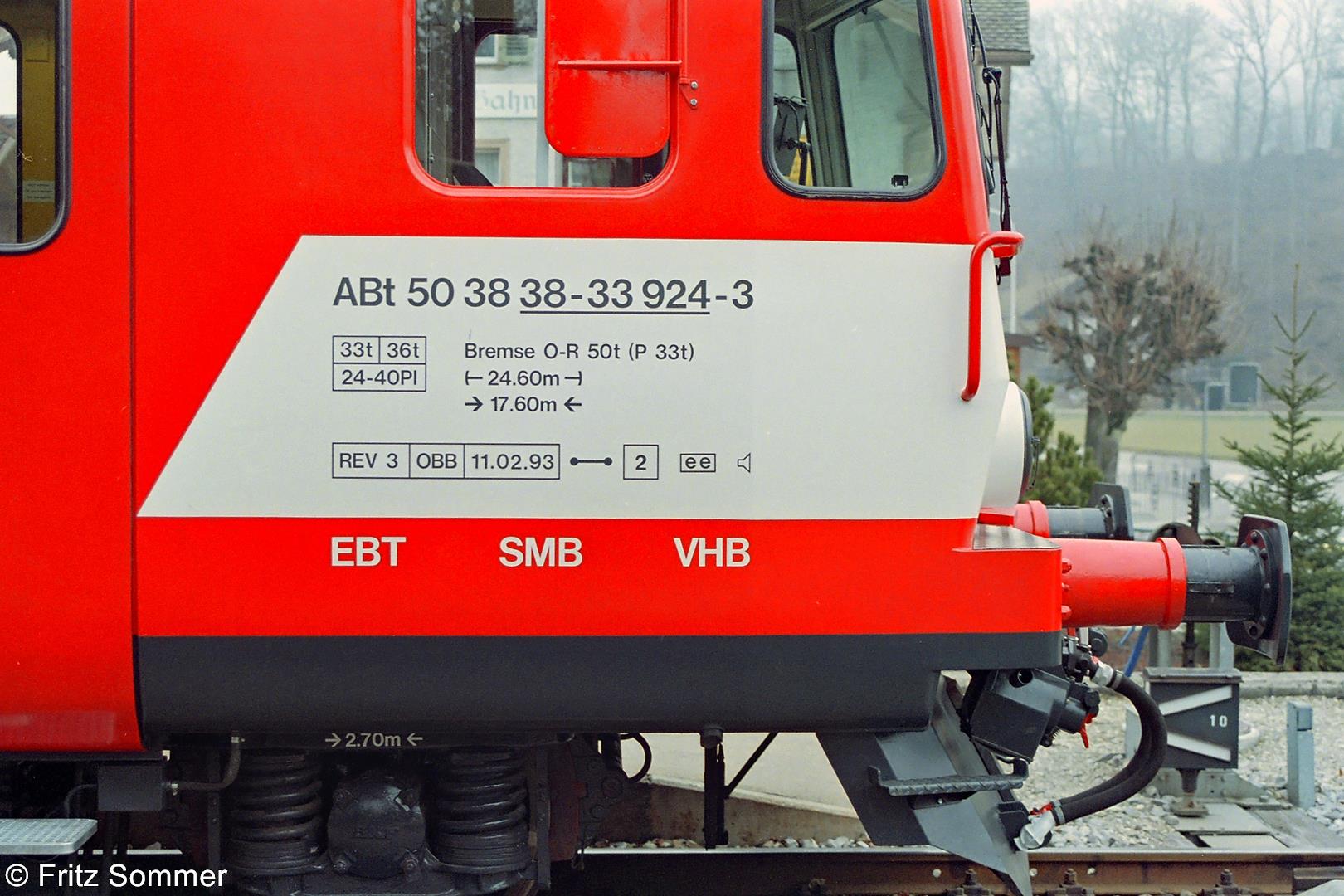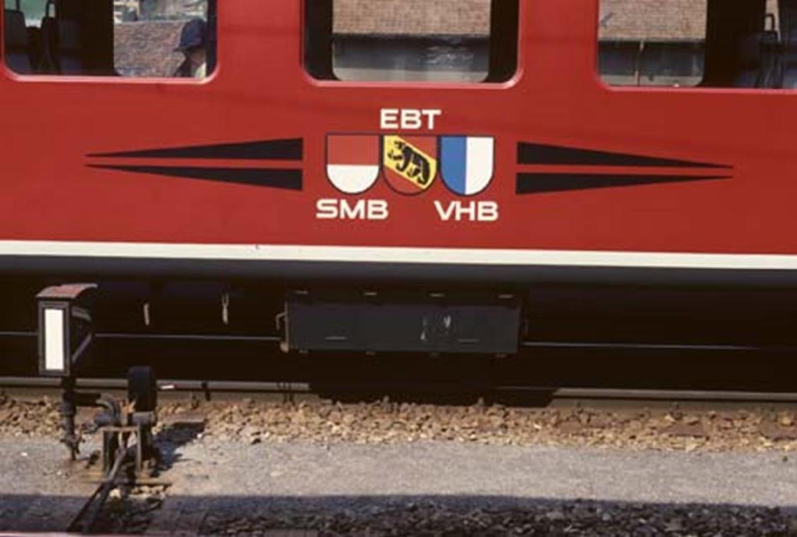 Fast unsichtbar klein sind die Initalen der Bahnen EBT, SMB und VHB unterhalb der Führerstände angebracht worden.