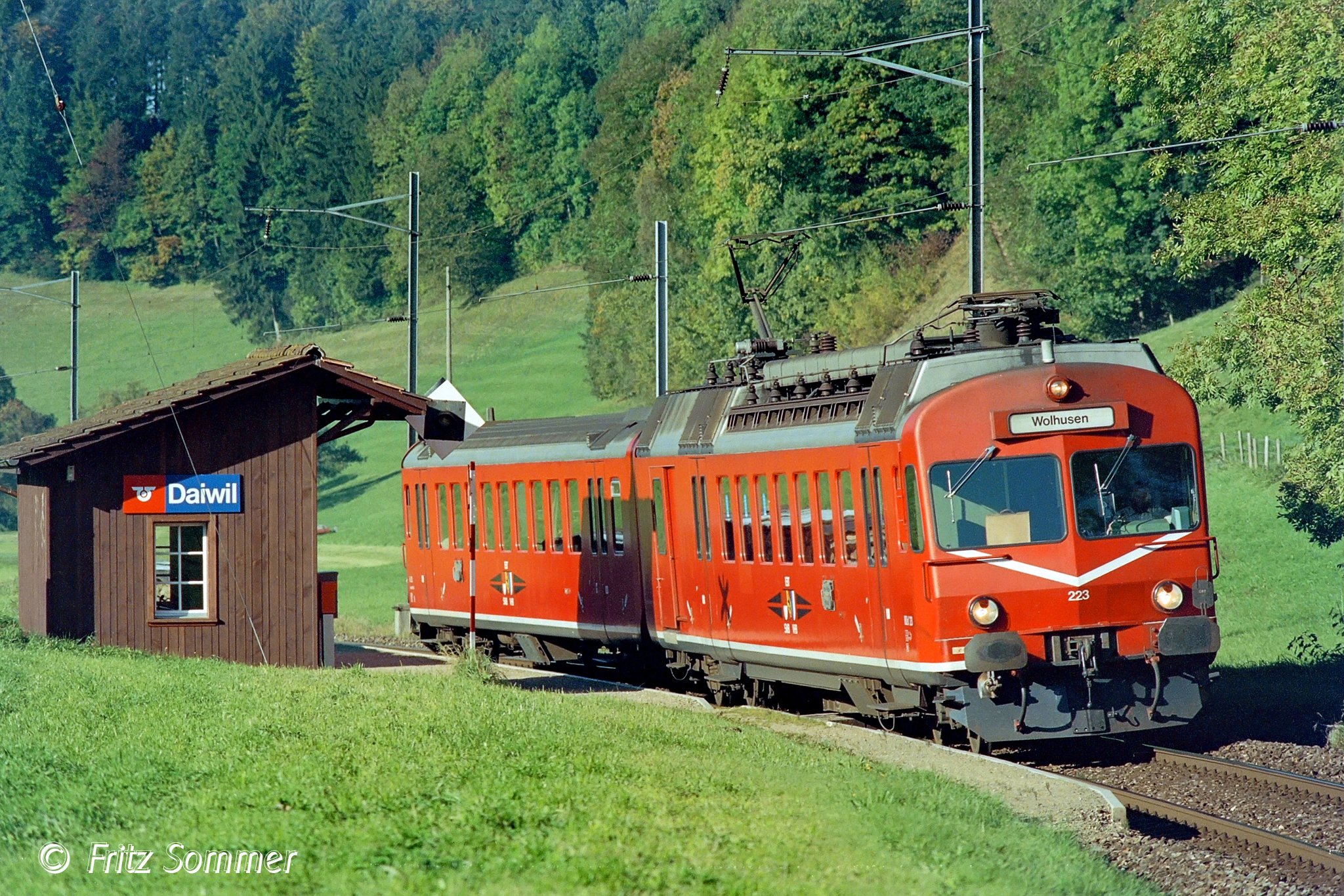 RBDe 4/4 I in seiner Ursprungslackierung. Bemerkensert ist hier nicht nur der Zug, sondern auch die inzwischen aufgehobene Haltestelle Daiwil zwischen Willisau und Menznau