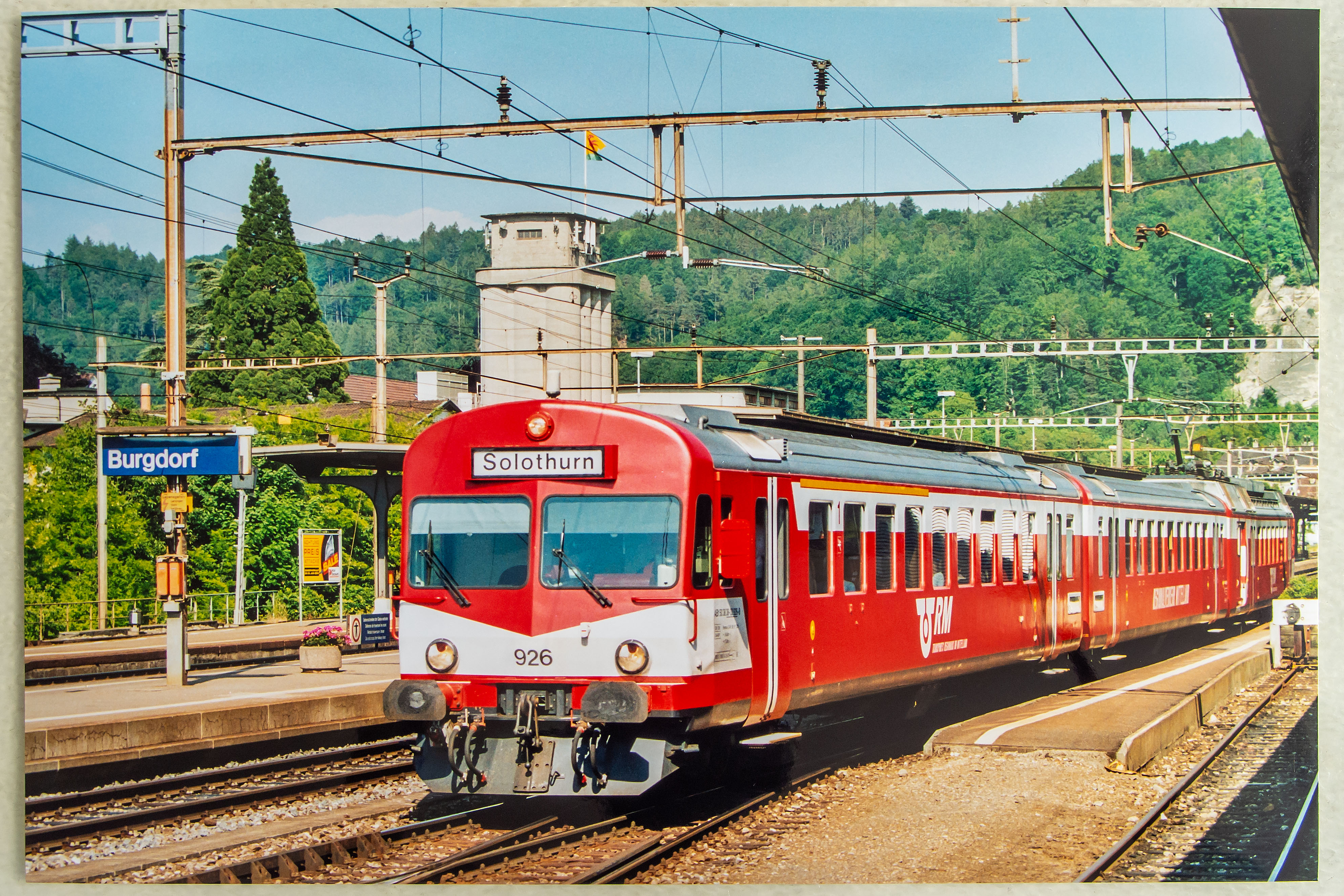 Der ABt 926 mit Zwischen- und Triebwagen in Burgdorf. Deutlich sind hier die senkrechten Türstreifen sowie der grossen Schriftzug am Mittelwagen zu erkennen.