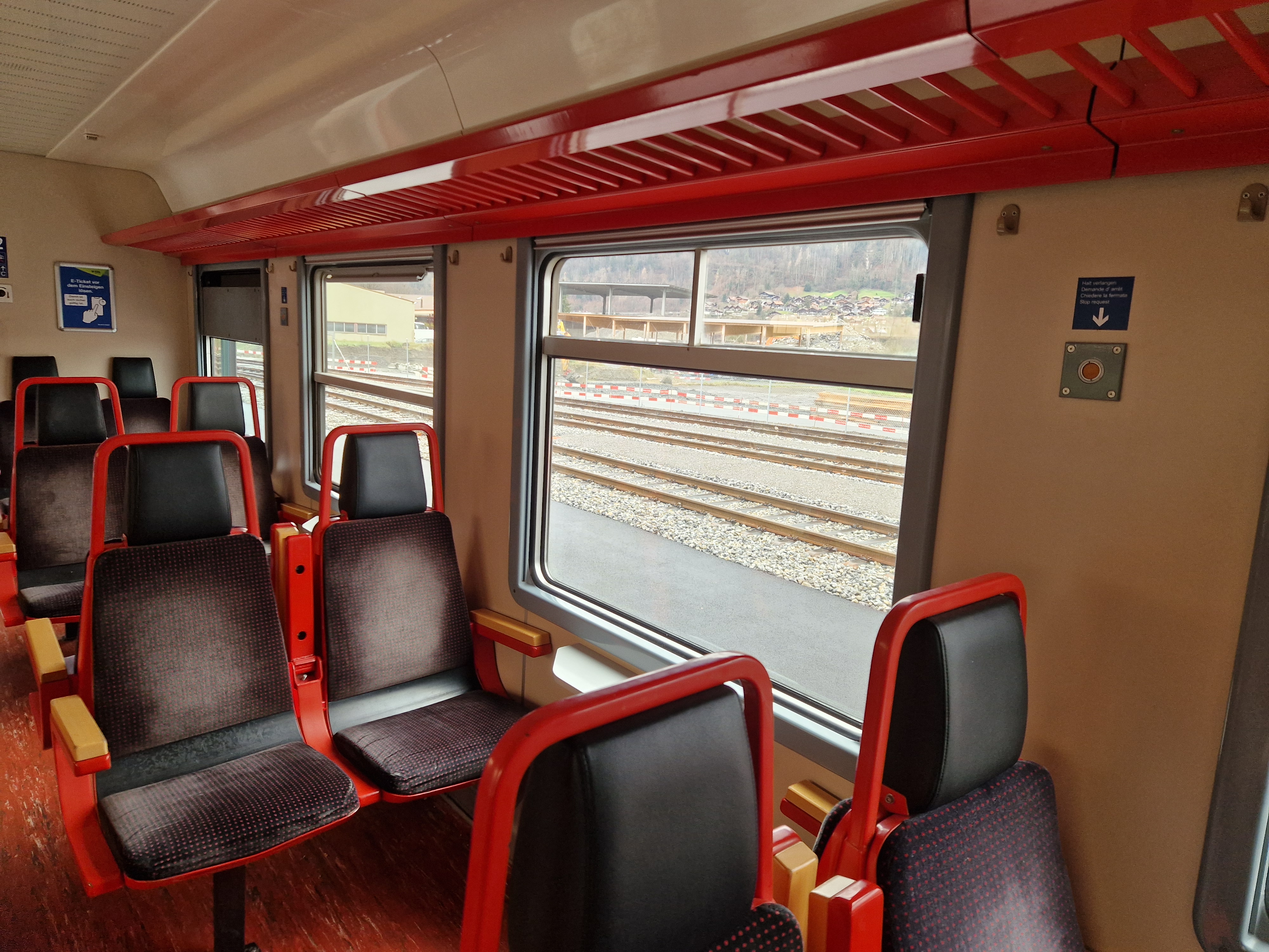 Blick ins Abteil des RBDe 282. Schön zu sehen sind die 3 verschiedenen Fenstertypen (Schiebeteil, Übersetzfester, Festfenster mit Zugzielanzeige).